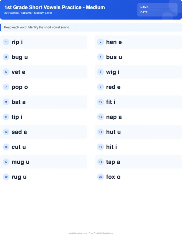 This 1st grade short vowels worksheet includes 20 medium-level practice exercises designed specifically for 1st Grade students, with moderately challenging exercises that strengthen core skills and encourage deeper thinking. These balanced activities progressively build complexity, making them perfect for students who have grasped the basics of short vowels and are ready to deepen their understanding. Students will practice identifying short vowel sounds in words, building foundational phonics skills. Skills covered include short vowel sounds, phonics, CVC patterns, decoding. Perfect for classroom practice, homework assignments, or homeschool curriculum. A separate printable answer key is included for quick and easy grading.
