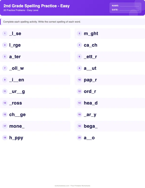 This 2nd grade spelling words worksheet includes 20 easy-level practice exercises designed specifically for 2nd Grade students, featuring straightforward exercises that build confidence and reinforce foundational concepts. These carefully designed activities use age-appropriate content, making them ideal for students who are just beginning to learn spelling words or need extra reinforcement. Students will practice grade-appropriate spelling words through various activities including fill-in-the-blank, word scrambles, and misspelling correction. Skills covered include spelling, word recognition, vocabulary, letter patterns. Perfect for classroom practice, homework assignments, or homeschool curriculum. A separate printable answer key is included for quick and easy grading.