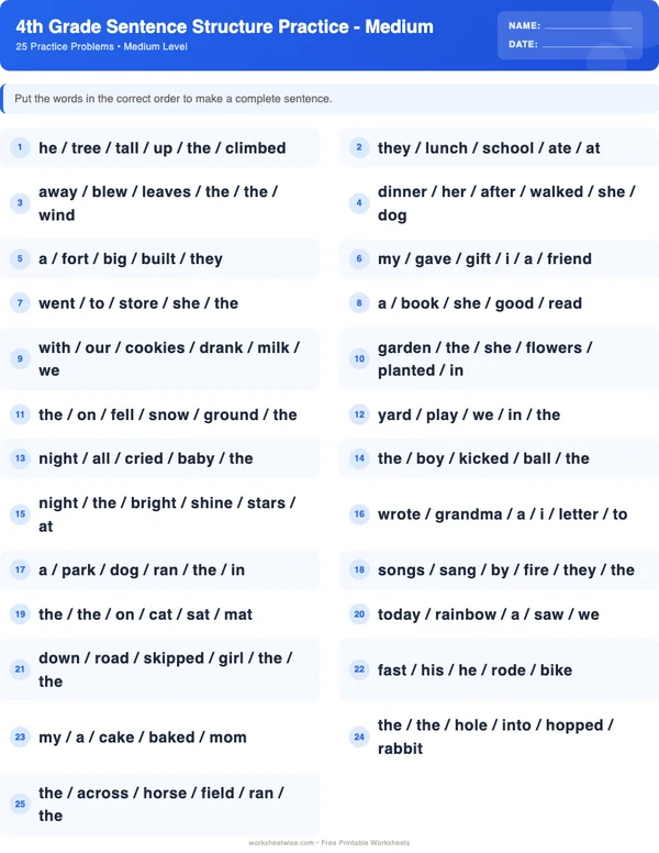 This 4th grade sentence structure worksheet includes 14 medium-level practice exercises designed specifically for 4th Grade students, with moderately challenging exercises that strengthen core skills and encourage deeper thinking. These balanced activities progressively build complexity, making them perfect for students who have grasped the basics of sentence structure and are ready to deepen their understanding. Students will practice arranging words into correct sentence order, developing syntax and sentence formation skills. Skills covered include word order, sentence formation, syntax, grammar. Perfect for classroom practice, homework assignments, or homeschool curriculum. A separate printable answer key is included for quick and easy grading.