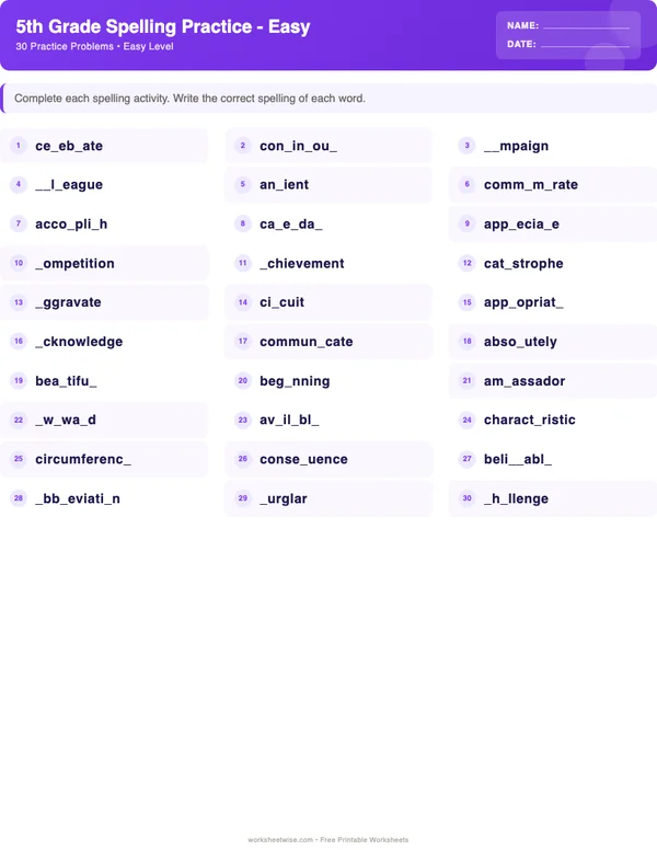 This 5th grade spelling words worksheet includes 30 easy-level practice exercises designed specifically for 5th Grade students, featuring straightforward exercises that build confidence and reinforce foundational concepts. These carefully designed activities use age-appropriate content, making them ideal for students who are just beginning to learn spelling words or need extra reinforcement. Students will practice grade-appropriate spelling words through various activities including fill-in-the-blank, word scrambles, and misspelling correction. Skills covered include spelling, word recognition, vocabulary, letter patterns. Perfect for classroom practice, homework assignments, or homeschool curriculum. A separate printable answer key is included for quick and easy grading.
